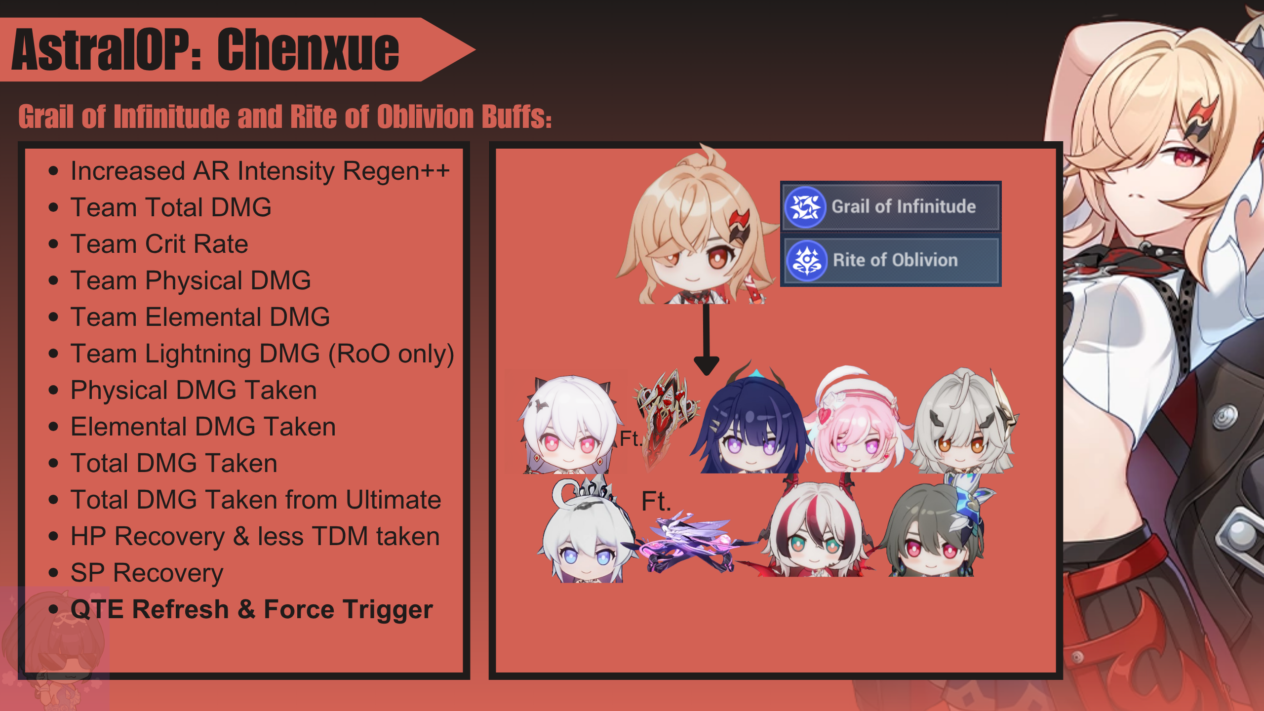Chenxue supports Grail of Infinitude and Rite of Oblivion. She can force QTE trigger of all off-field valkyries during Grail Stellar Outburst, as well as increasing enemies total DMG taken from Ultimates.