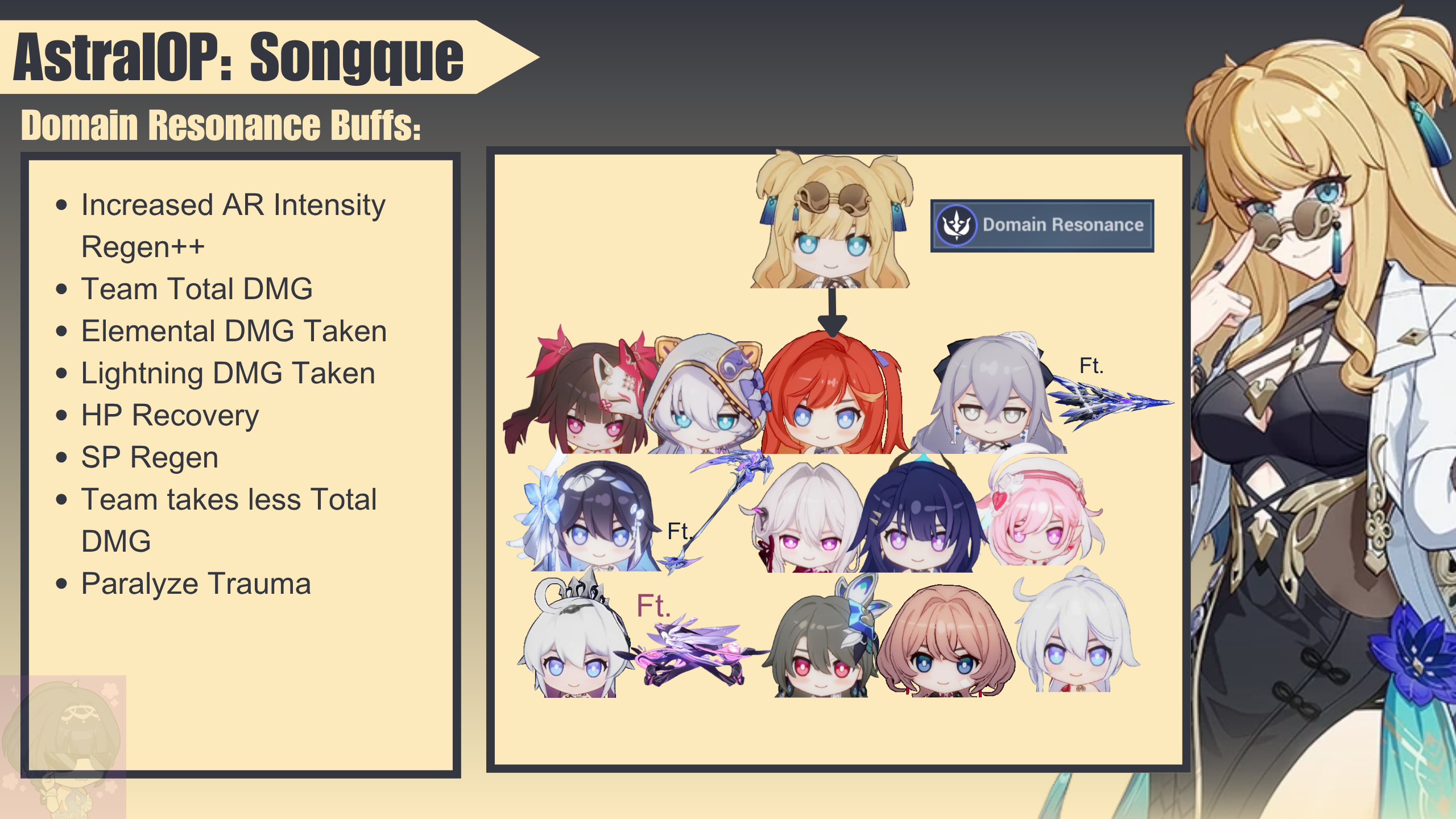 Songque is the first Premium AstralOP released during v7.3 (the first P2 patch). Unlike other AstralOPs who support specific AR Specializations, Songque supports those with Domain Resonance Attribute, which currently comprises about 50% of all AR valkyries.