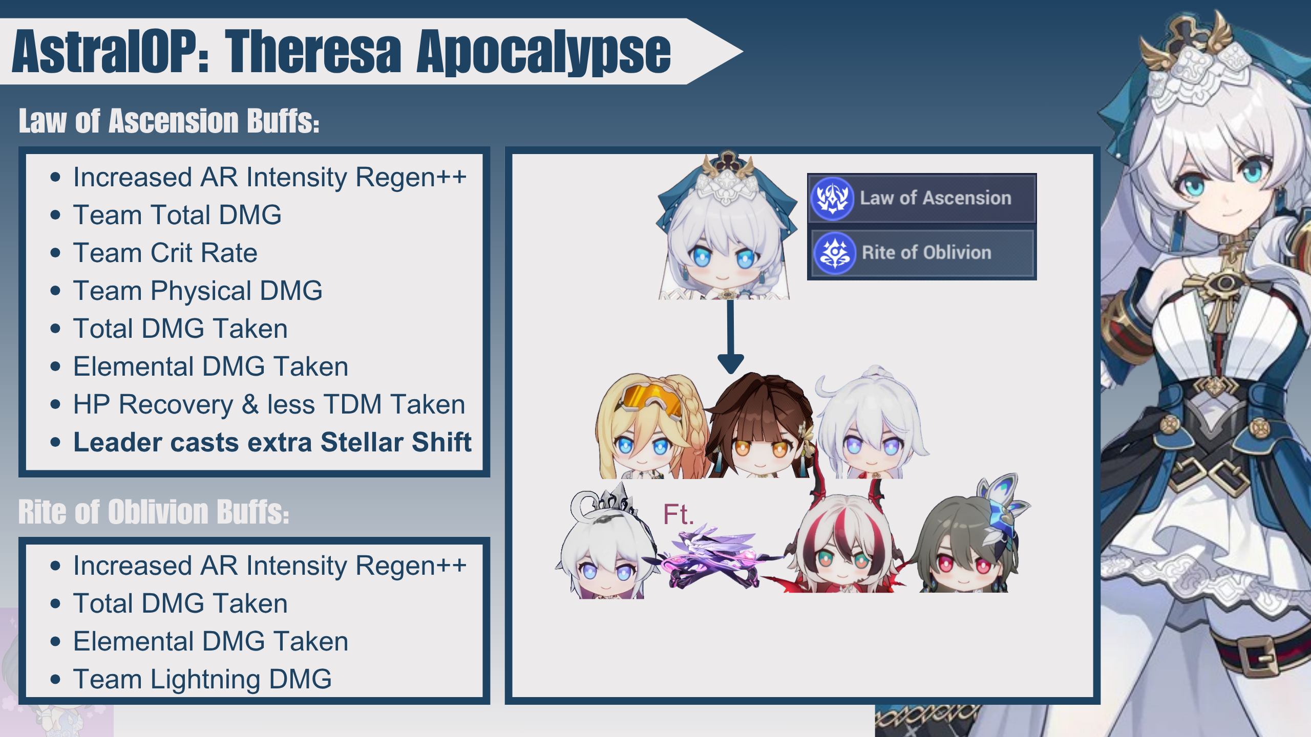 Theresa Apocalypse supports Law of Ascension and Rite of Oblivion. Aside from buffs, when supporting Law of Ascension teams, the leaders can cast one more , and Theresa herself attacks once more.