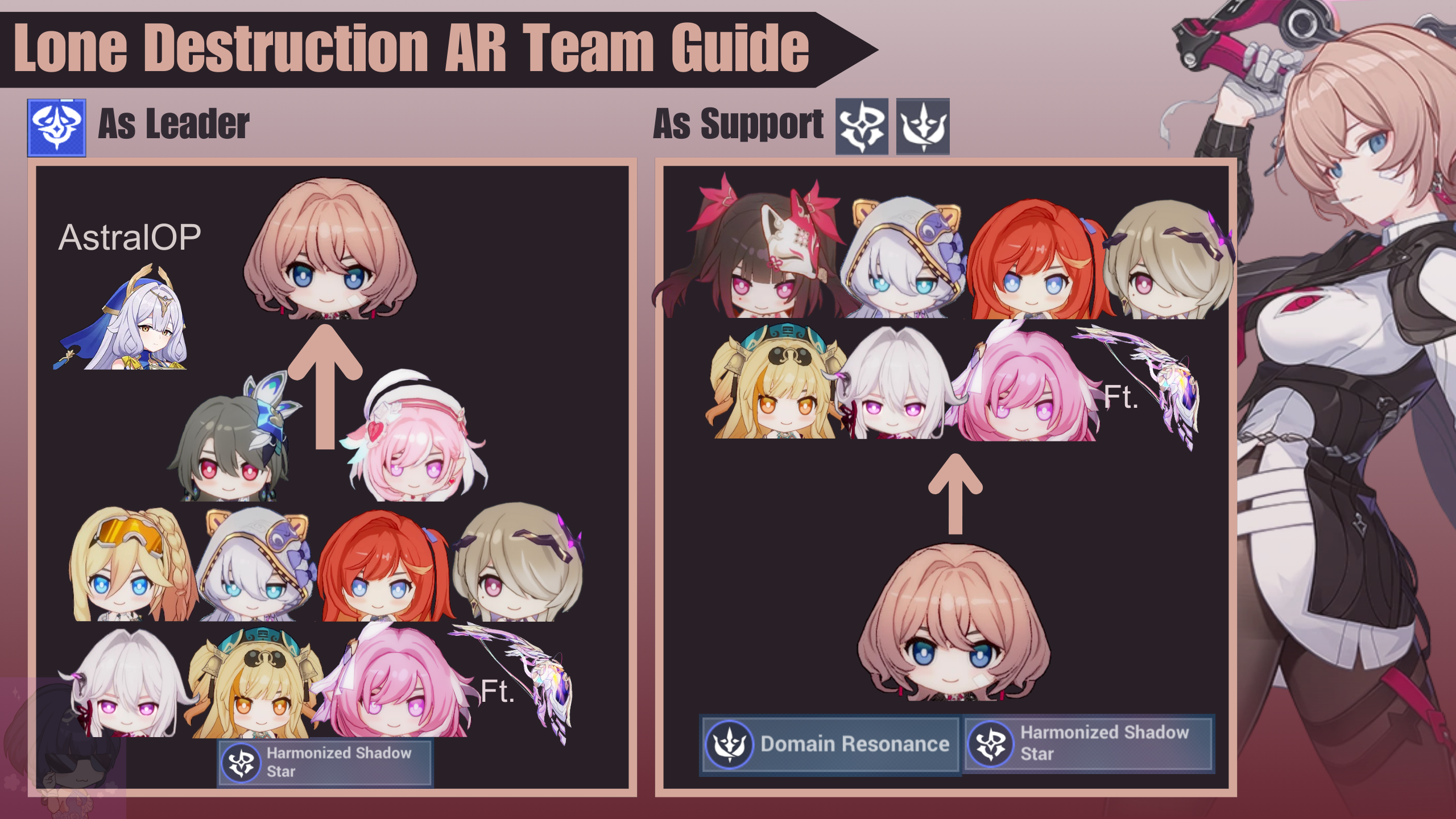Lone Destruction: Shadowchaser (LDS) is a Wheel of Destiny valkyrie, so she has to be supported by AR valkyries with Harmonized Shadow Star trait, otherwise her potentials aren’t fully unlocked. However, using Rite of Oblivion valkyries CAN work until you get Harmonized Shadow Star valkyries, as they provide general buffs.