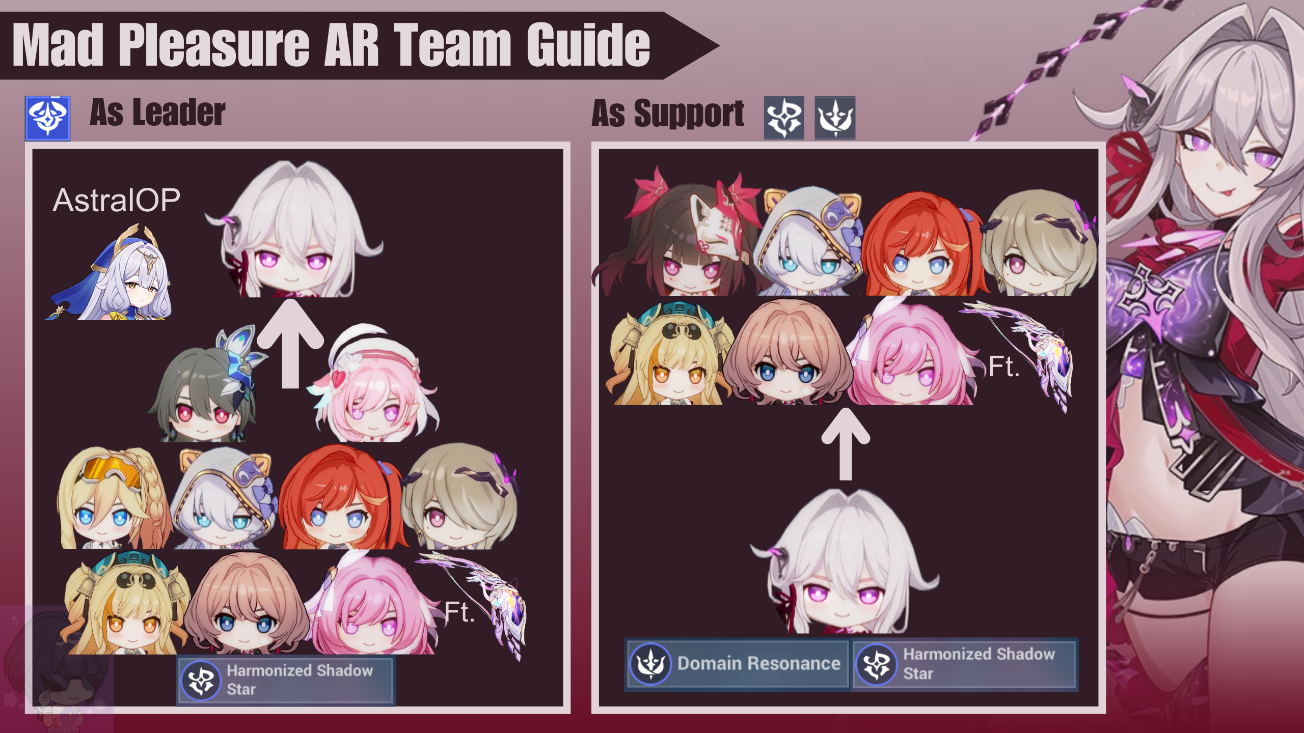 Mad Pleasure: Shadowbringer (MPS) is a Wheel of Destiny valkyrie, so she has to be supported by AR valkyries with Harmonized Shadow Star trait, otherwise her potentials aren’t fully unlocked. However, using Rite of Oblivion valkyries CAN work until you get Harmonized Shadow Star valkyries, as they provide general buffs.