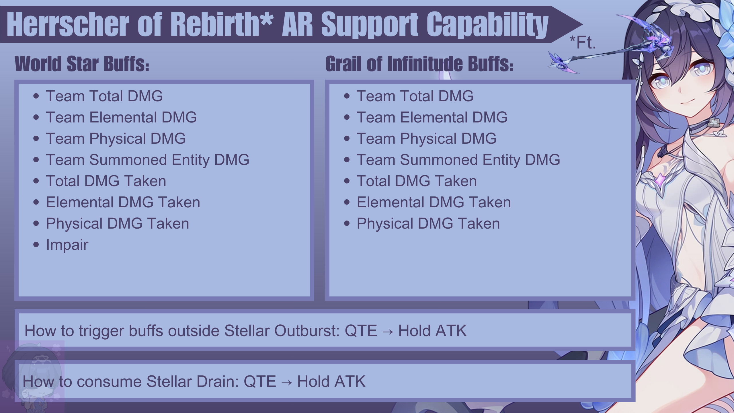 As support in both forms, Herrscher of Rebirth (HoRb) is quite quick and capable of applying buffs. She is also able to consume rather quickly on both modes.