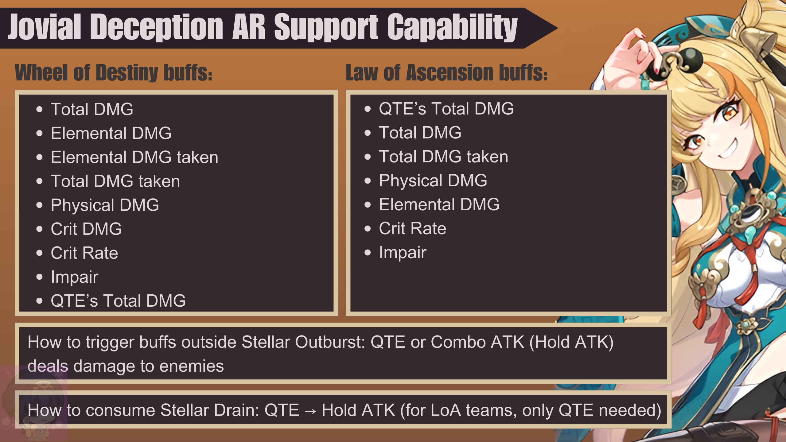 Jovial Deception: Shadowdimmer (JDS) is an especially good Law of Ascension support against SD-type enemies and for Physical valkyries. Her buffs are relatively good, consuming is really long in Wheel of Destiny teams, but much faster in Law of Ascension team.