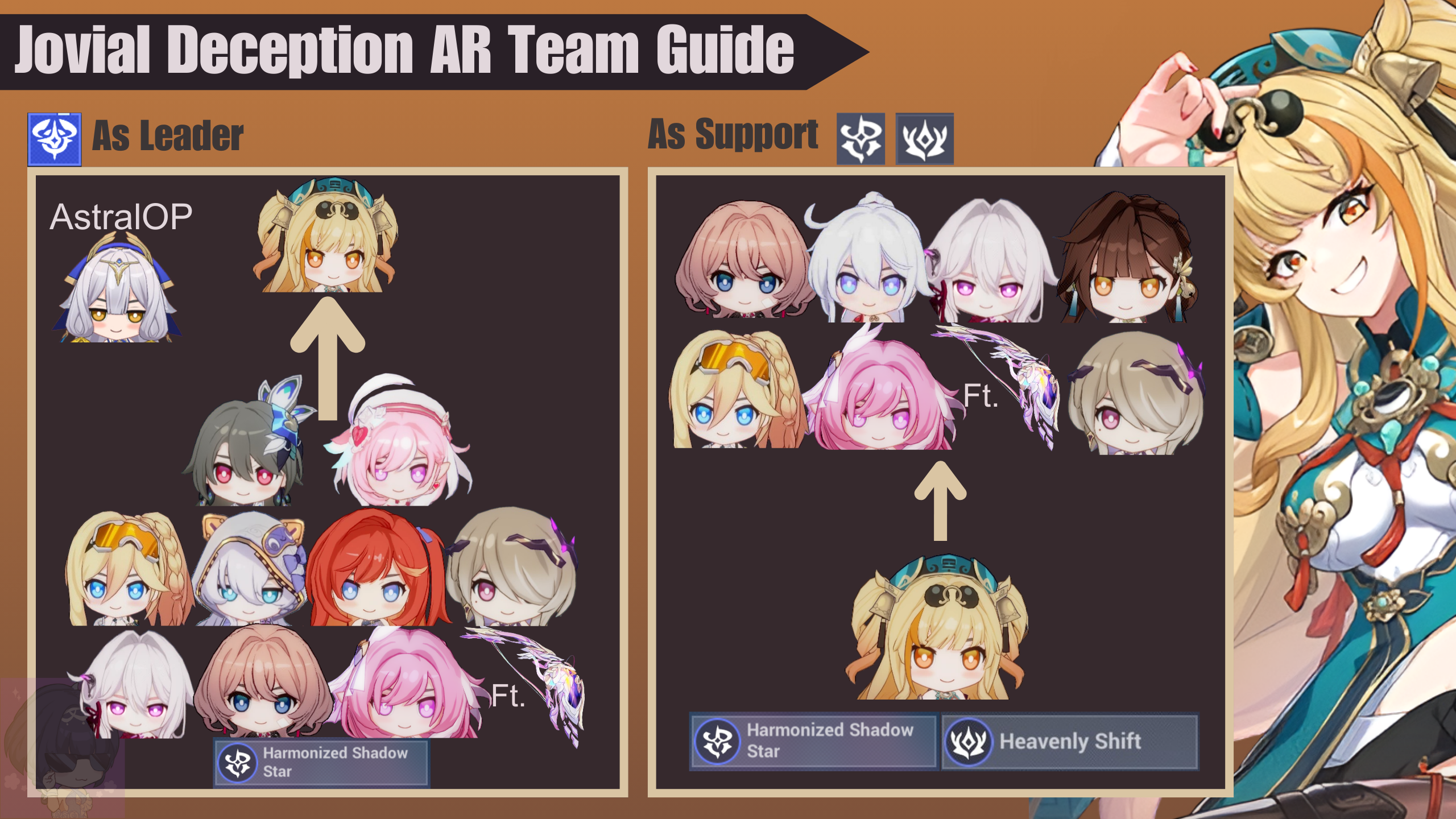 Jovial Deception: Shadowdimmer (JDS) is a valkyrie, so she has to be supported by AR valkyries with Harmonized Shadow Star trait, otherwise her potentials aren’t fully unlocked. However, using Rite of Oblivion valkyries CAN work until you get Harmonized Shadow Star valkyries, as they provide general buffs.