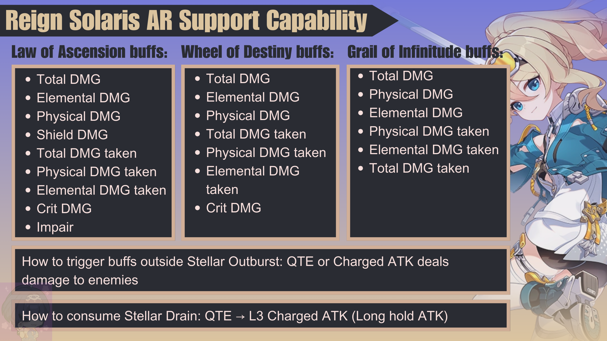 Reign Solaris (RS) can support Law of Ascension, Wheel of Destiny, and Grail of Infinitude valkyries. She can provide buffs with just QTE, but consuming takes much longer time.